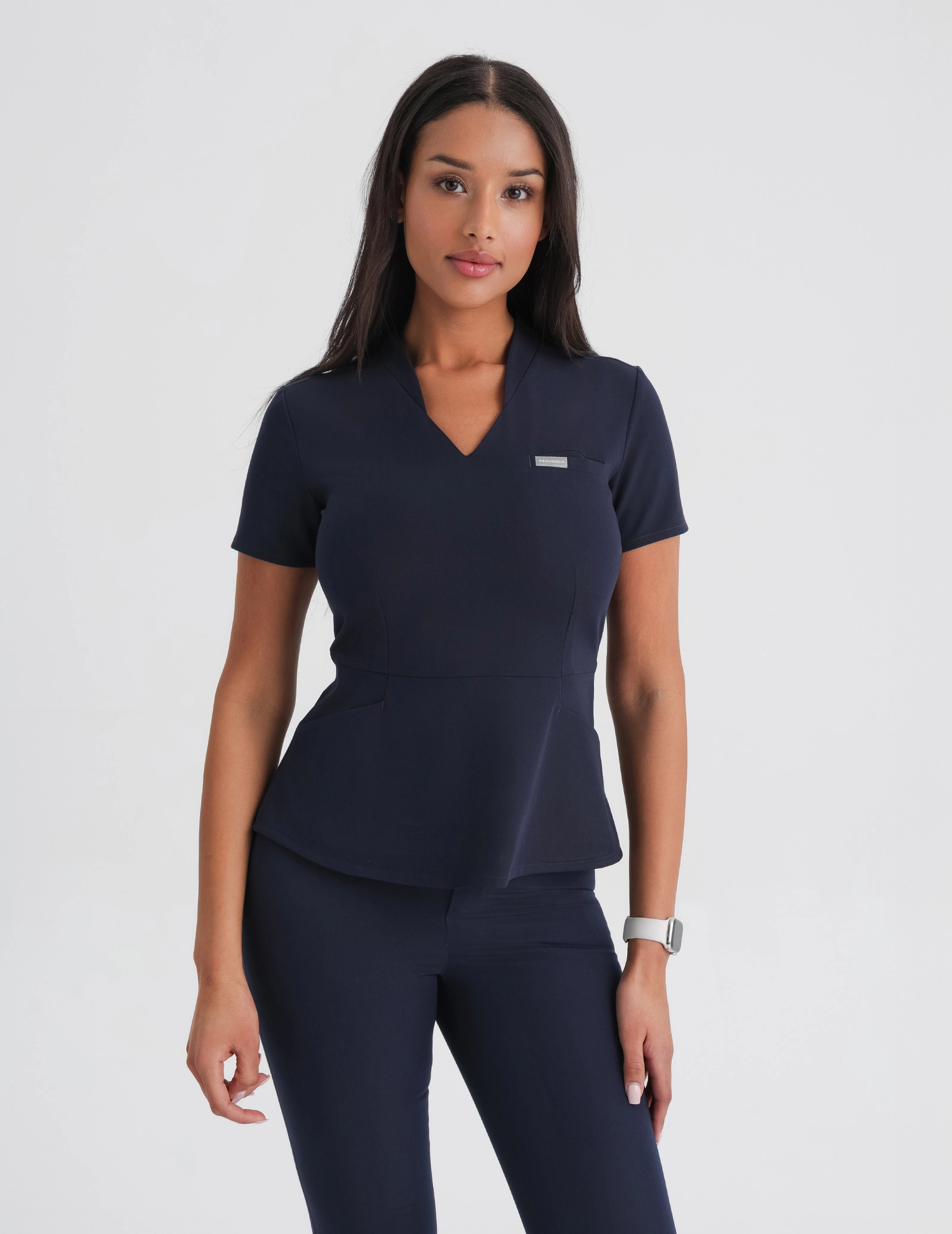 Ismerd meg a Női Orvosi Felsőt Kori – a modern elegancia és funkcionalitás tökéletes kombinációját, amelyet azoknak a nőknek terveztünk, akik fontosnak tartják a professzionális megjelenést az egészségügyi munkájuk során. A finom peplumos szabás gyönyörűen formálja az alakot, kiemeli a derekat, és finoman nőies sziluettet kölcsönöz, miközben egész napos mozgásszabadságot biztosít.